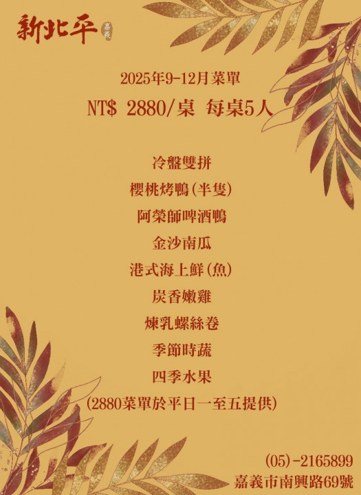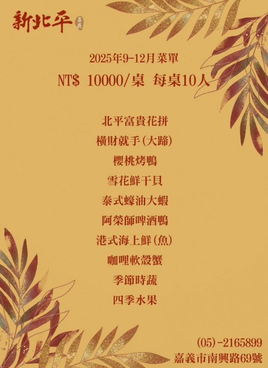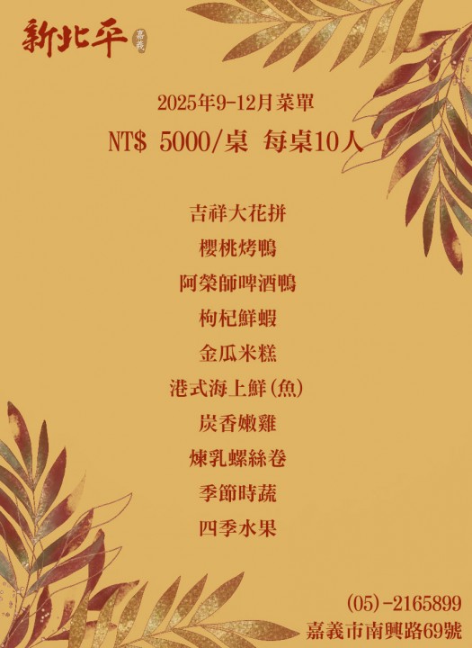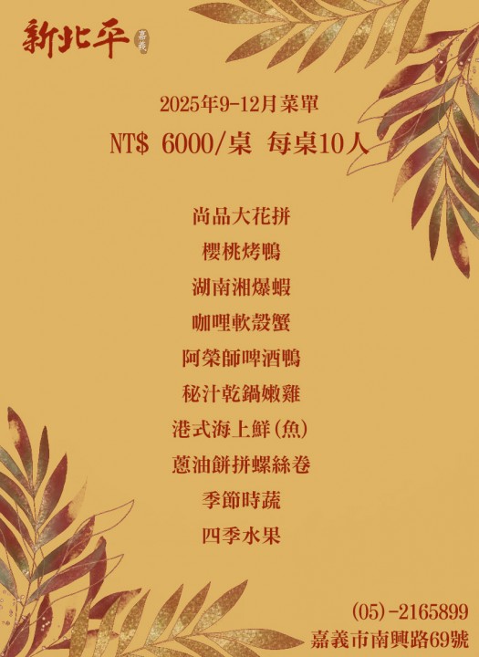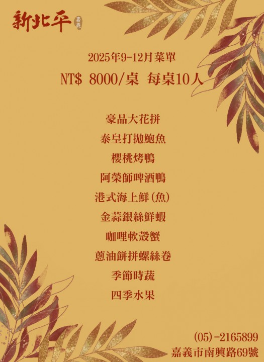 座落在嘉義市區的南興路,新北平由擁有五十年廚藝經驗的阿榮師領軍,以多樣化的合菜菜單、豐富的單點料理,成為嘉義人心中最經典的桌菜餐廳。無論是年節圍爐、尾牙春酒,或是三五好友的日常聚會,我們都能為你準備豐盛的饗宴。
