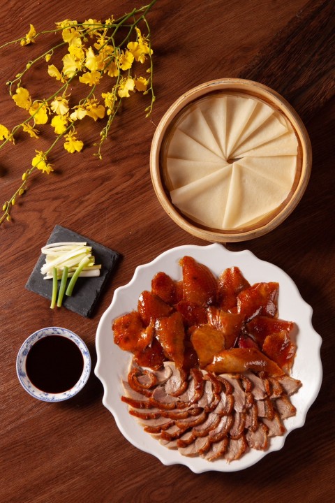 我們的櫻桃烤鴨是桌上必備的經典。選用肉質肥美的櫻桃鴨,以傳統北京烤鴨工法細心烤製,外皮酥脆金黃,內層肉質則保持鮮嫩多汁。搭配主廚親手熬煮、傳承五十年的獨門甜麵醬,香氣在口中層次堆疊。享用完片鴨後,鴨架還能做成香氣十足的鹹酥鴨架,加入九層塔與蒜頭爆炒,口感酥脆、香氣逼人,保證讓你吮指回味。